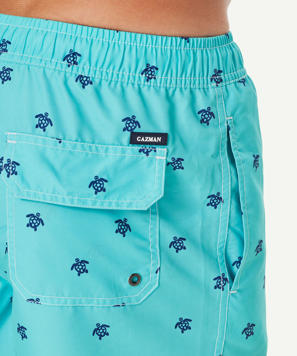 Make a splash this spring with our Turtle Print Swim Shorts. Crafted from 100% recycled polyester, these shorts feature an elastic waistband with a functional drawstring for a secure and comfortable fit. With convenient side pockets, they're perfect for carrying your small essentials. Perfect your poolside style and pair these swim shorts with our French Linen Shirt and GAZMAN Cap for breezy, cool, spring style.